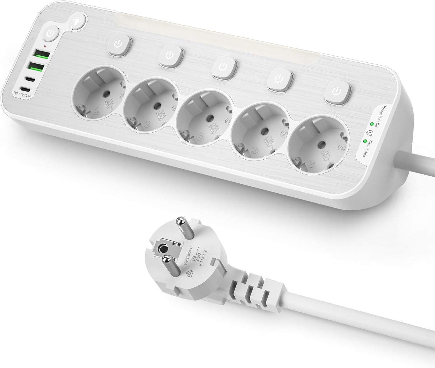 Tour Multiprise Avec Interrupteur Individuel, Multi Prise Électrique Prise Parafoudre Et Surtension Avec 4 Interrupteurs, Veilleuse Design Originale Et Usb-A, Usb-C Multiprise Rallonge 5M Câble