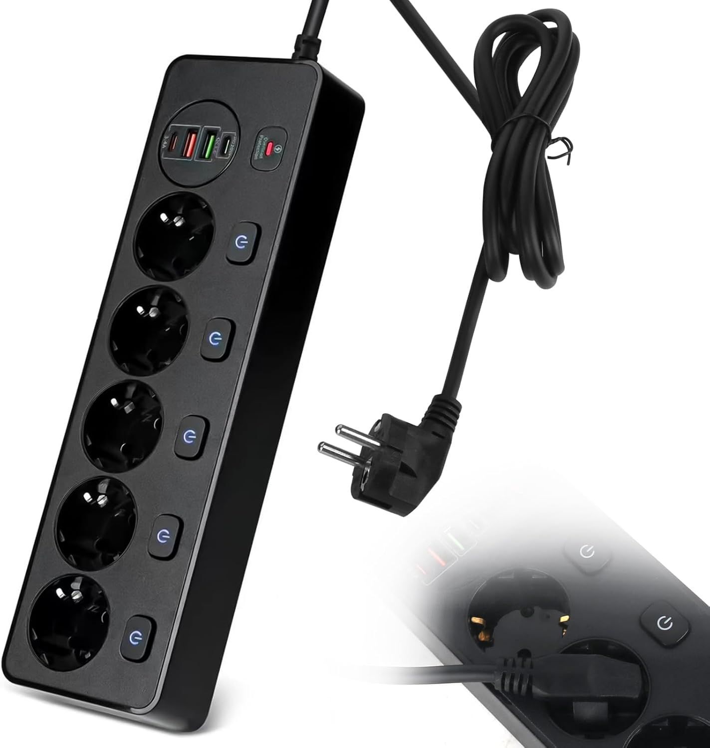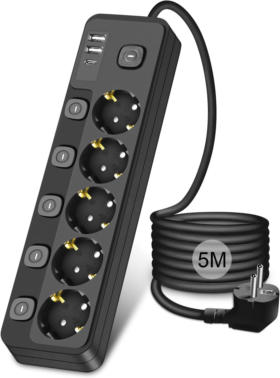 Multiprise Avec Interrupteur 5M, 5 Prises Multiprise Electrique Avec 2 Usb-A Et 1 Usb C, Prise Multiple Parafoudre Parasurtenseur Pour Bureau/Cuisine, Noir (5M)
