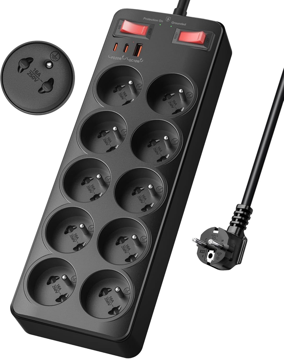 JEXNOVASHOP-Bloc Multiprise avec Interrupteur,Multiprise Parafoudre et Surtension,Prise Multiple avec USB C PD20W,Bloc 10 Prises Française 16A 2P+T Rallonge Electrique 2m Parasurtenseur pour Maison,B