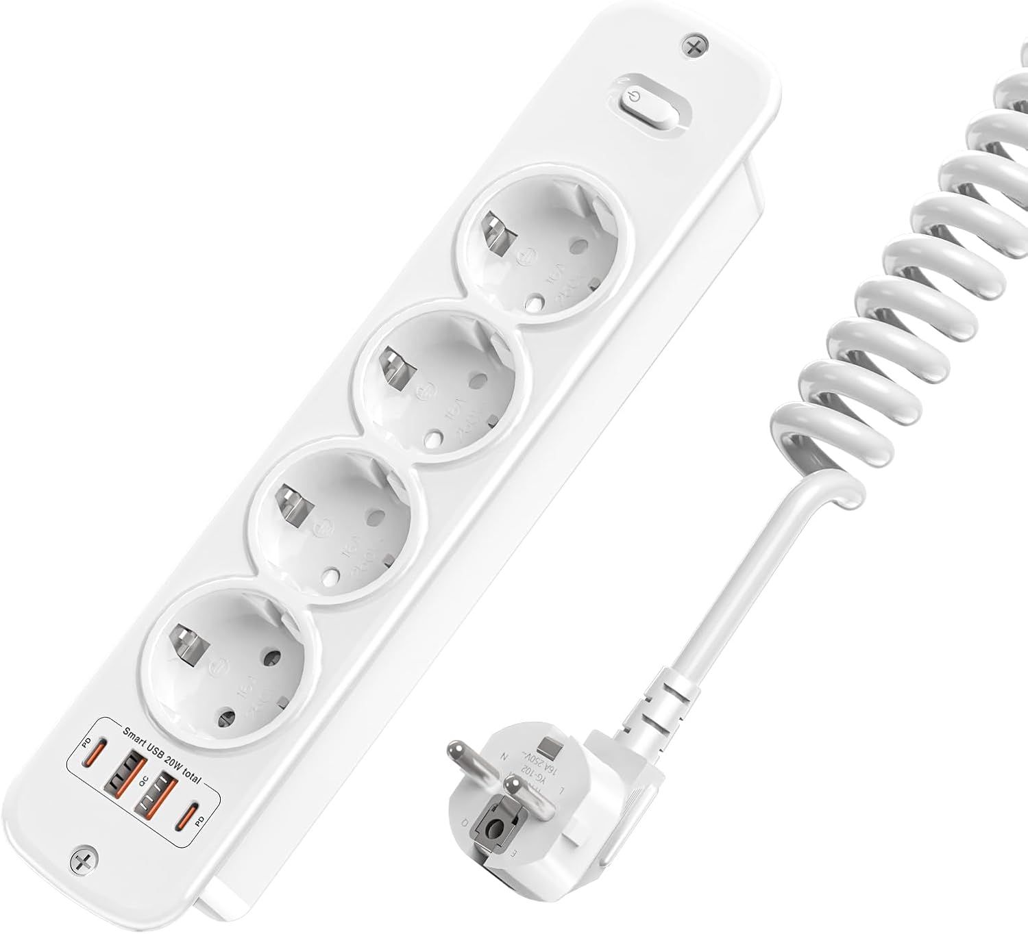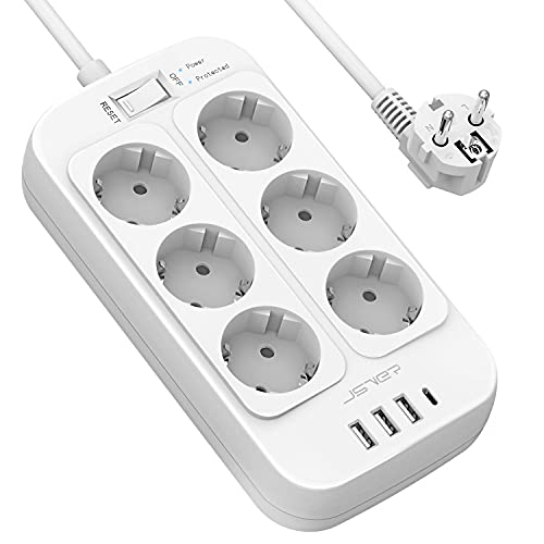 JSVER Multiprise 5M,Bloc Multiprise 6 Prises avec 4 Ports USB Chargeur (3 USB A+1 USB C) Prise Multi Parasurtenseur Parafoudre et Surtension avec Interrupteur pour Smartphone Tablette-Blanc
