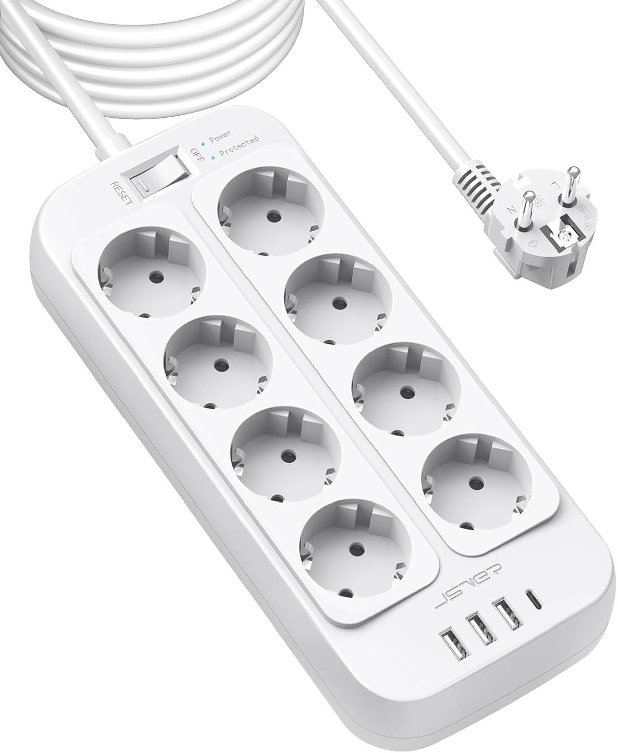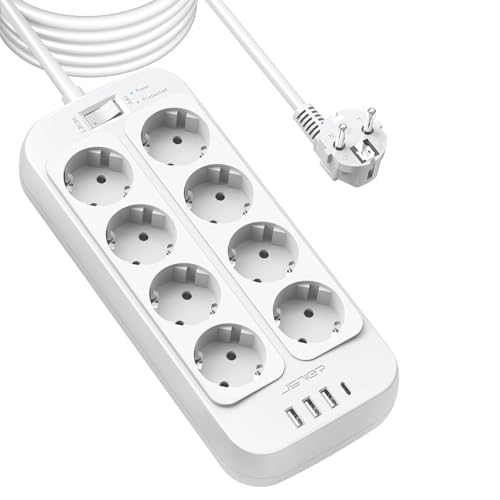 JSVER Multiprise Parasurtenseur,Bloc Multiprise 8 Prises avec 4 Ports USB Chargeur (3 USB A+1 USB C) Prise Multi Parasurtenseur Parafoudre et Surtension avec Interrupteur Cable 5M-Blanc