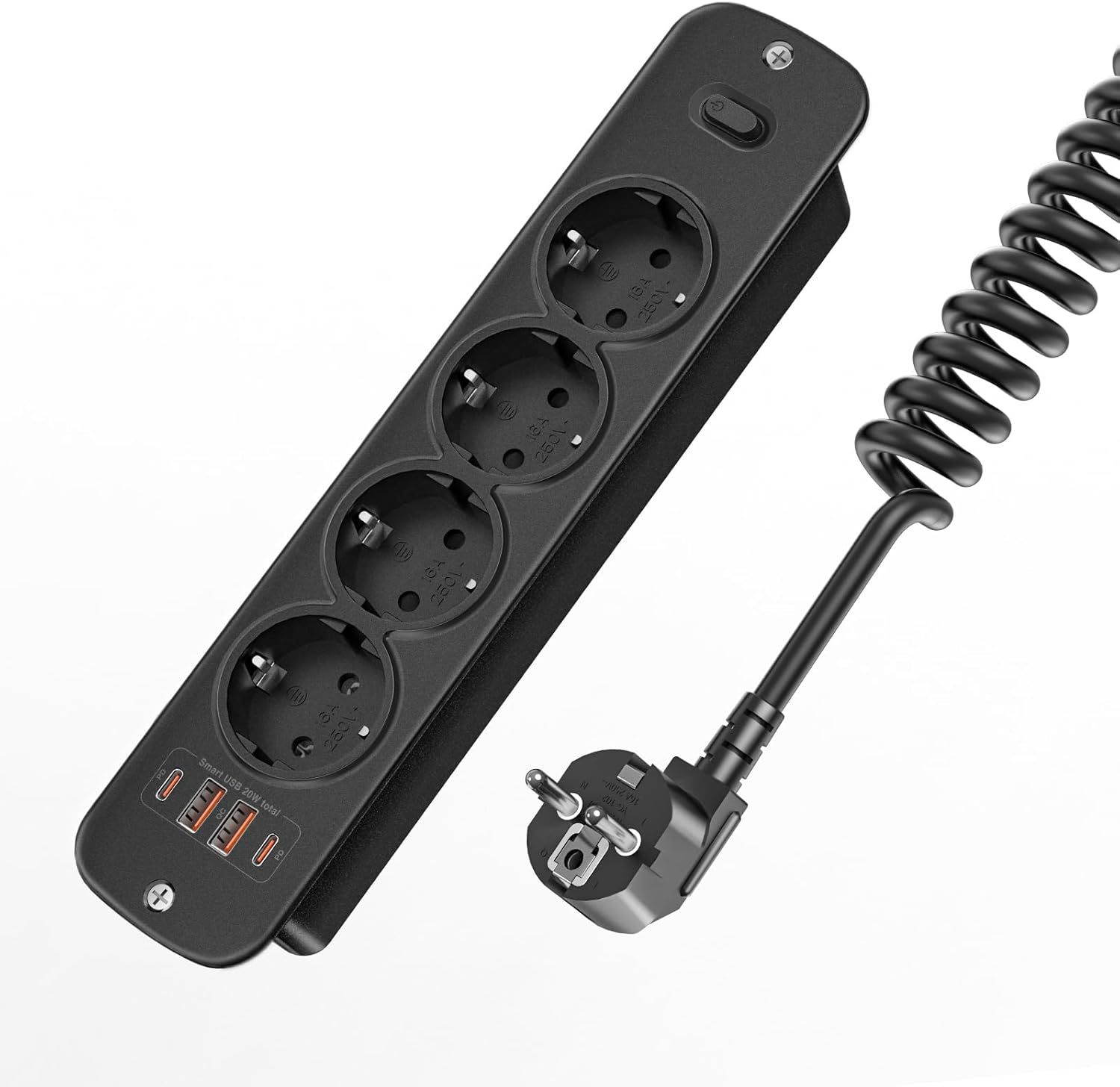Prise encastrable escamotable, 4 Prises (4000 W/16 A), multiprise avec 2 USB-C (PD20W) et 2 USB-A (QC18W), Prise de Table avec parasurtenseur pour Cuisine et Bureau, câble spiralé de 1,5 m, Noir