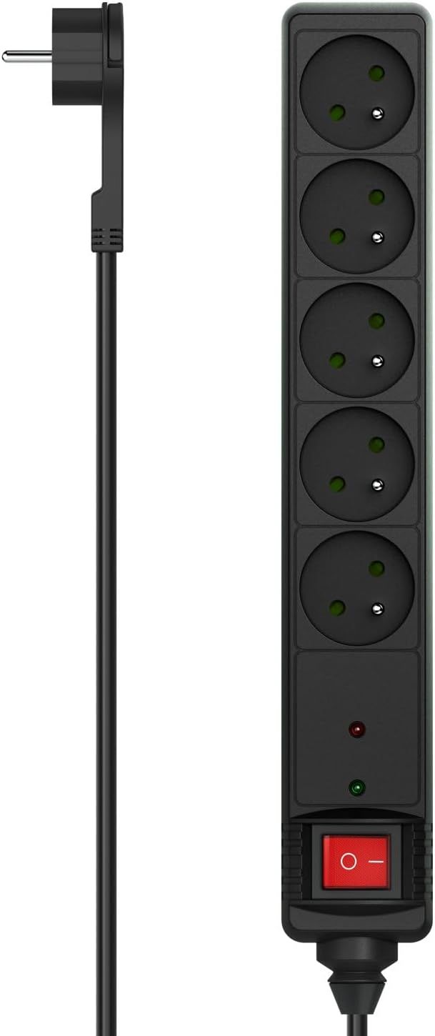Multiprise Parasurtenseur avec Interrupteur Lumineux (Bloc 5 Prises 16A, Rallonge 1.5m, Prise Multiple économie d'énergie, Prises 45°, Prise Male Plate, 3680W, Cable H05VV-F3G1.5) Noir