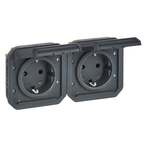 LEGRAND - Prise Etanche Double IP55 avec Terre Plexo - Prise 2P+T 16A Complète avec Volet - Pour Pose en Apparent - Montage Vertical - Fabriqué En France - Gris
