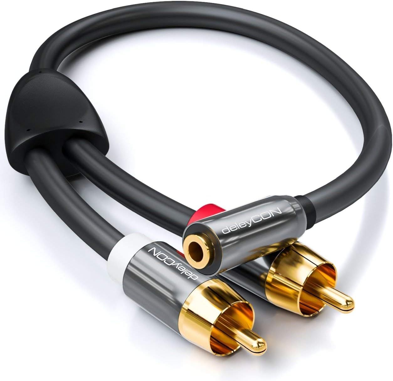 deleyCON 20cm Audio Adaptateur - Prise Jack 3,5mm Pour 2x Prise RCA en Métal - Boîtier de son Tablette Pour Ordinateur Portable Smartphone TV DVD - Noir
