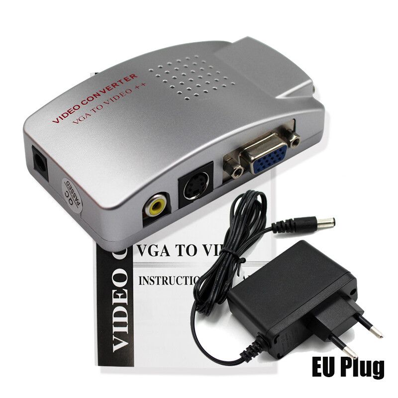 Convertisseur d'adaptateur vidéo composite VGA vers AV RCA,ordinateur portable,PC vers TV,boîtier de commutation,prise en charge S-vidéo,sortie VGA,signal d'ordinateur NTSC/PAL - Type With EU Plug