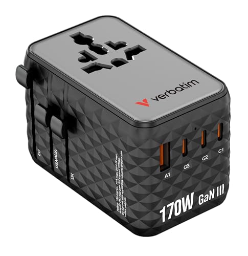 Verbatim Adaptateur de Voyage GaN 170W, Adaptateur Universel avec 3 Ports USB-C, 1 Port USB-A, 2 Prises USA/JP, Charge Rapide, Prise Universelle, utilisable dans Le Monde Entier, Noir, 100–250V