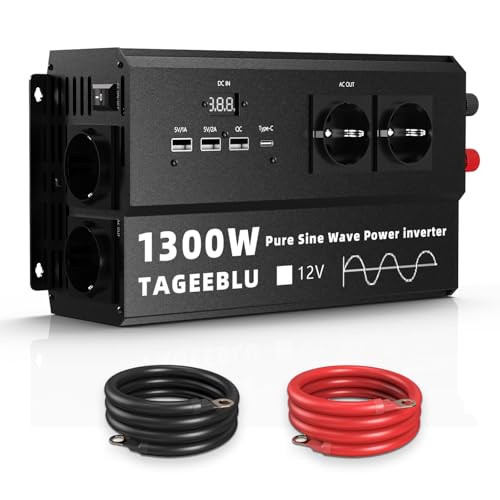 TAGEEBLU 1300W Pur Sinus convertisseur 12v 220v, transformateur 12v 220v avec écran LCD, 4 Prise UE, Type C 30W, Charge Rapide USB 25W, 3 Ports USB