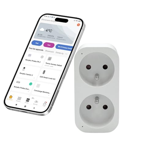 Konyks Priska Duo FR prise double Wi-Fi + BT, contrôle ON/OFF à distance, suivi de la consommation des 2 appareils simultanément, compatible Smartlife et Tuya, Amazon Alexa et Google Home