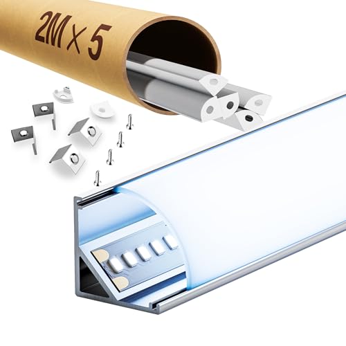 KOSOOM Profilé LED 45 degrés pour bandes LED, 2 m x 5 pièces 10 m, dimensions 15,8 mm x 15,8 mm, pour bandes LED d'une largeur inférieure à 10 mm, avec accessoires de montage