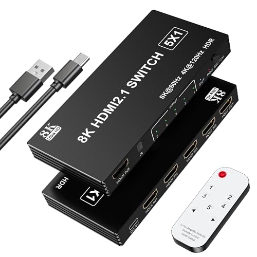 Commutateur HDMI 2.1 Switch 5 Entrées 1 Sortie, 8K 60Hz 4K 120Hz 48Gbps HDMI Switch UHD HDR 3D Compatible avec PS5/Switch/Xbox/Steam Deck/PC/HDTV/Moniteur/Projecteur