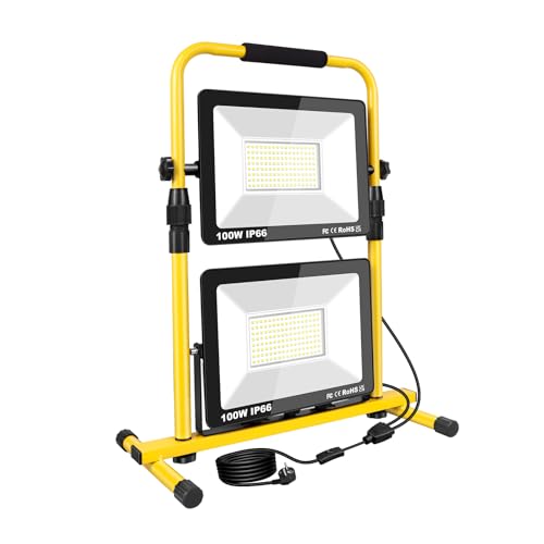 RIGIDON 200W Projecteur Led Chantier, 20000LM Portable Lampe Chantier Led avec Prise, Projecteurs de travail pour Travaux, Atelier, Garage, Bricolage, Construction, Etanche IP66 6000K Blanc