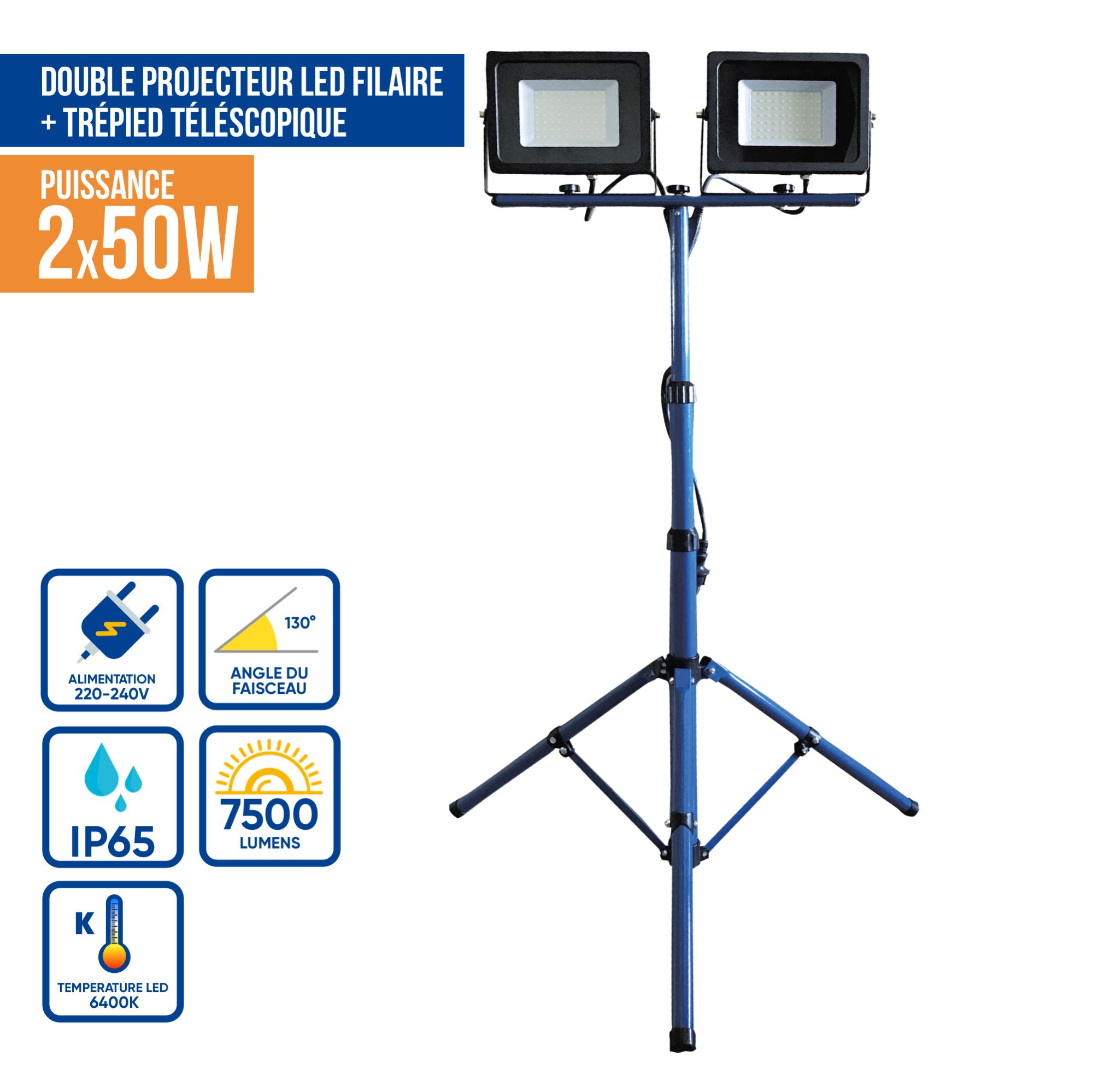 Projecteur De Chantier Led 2x50w 2 Têtes Sur Pied Professionnel Ip65 - KELI