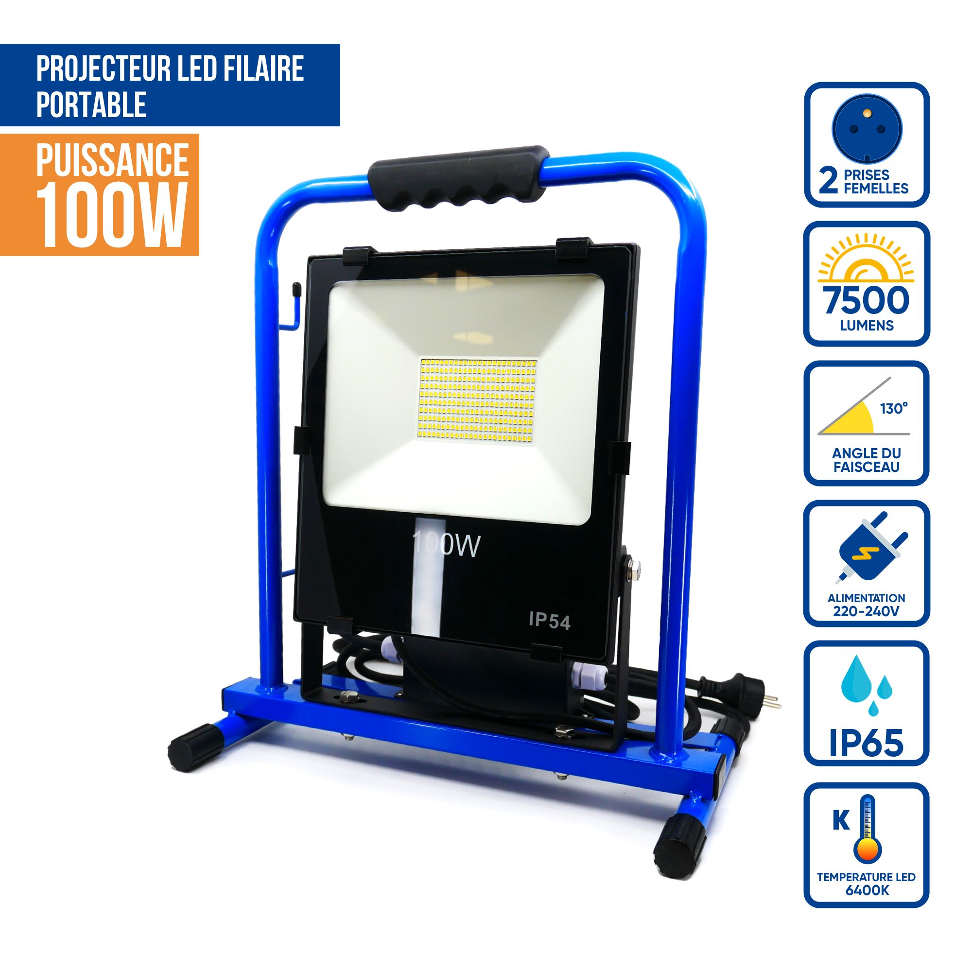 Projecteur De Chantier Led 100W Professionnel (2 Prise Femelles Au Dos) IP54 - KELI