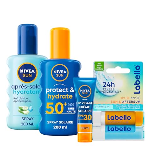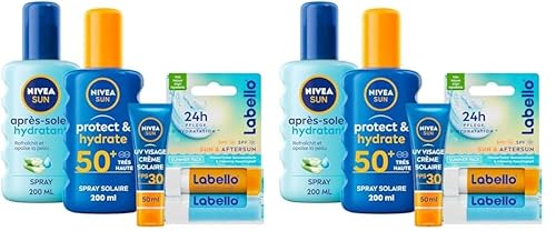 NIVEA SUN - Coffret Protection Solaire - Crème Solaire Visage FPS 30 (50 ml) + Spray Protect & Hydrate FPS 50+ (200 ml) + Spray Après Soleil (200 ml) + Duo Labello Sun & After Sun + Ballon De Plage