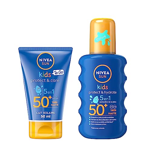 Lot NIVEA SUN Kids Spray Protect & Play coloré FPS 50+ (1x200 ml), protection hydratante adaptée à la peau des enfants + Lait solaire Protect & Play Enfants FPS 50+ Format voyage (1 x 50 ml)