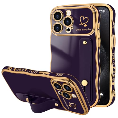 LLZ.COQUE Coque pour iPhone 15 Pro Max Ondulée en TPU avec Bracelet Motif Coeur d'amour Mignon, Étui Housse Galvanisé Forme Ondulée Bouclée avec Protection de Caméra pour iPhone 15 Pro Max,Purple