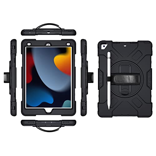 Étui de Protection pour iPad 10.2 2019/2020/2021 génération avec Film de Protection d'écran, Porte-Crayon, Support Rotatif à 360 °, dragonne, béquille de Protection Robuste (Noir)