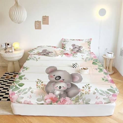 XCQHZYQ Drap Housse en Microfibre Dessin Animé Animal Koala Floral, Antidérapants Résistant aux Rides 30 cm Drap Housse Matelas Epais Protection de Matelas 160x200 cm avec 2 Taie d'oreiller 65x65 cm