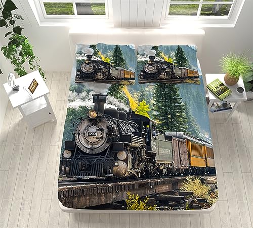 Drap Housse 160x200 cm, Train à Vapeur RéTro Parure de Lit Microfibre BrosséE Douce espirant Résistant Rides Drap Housse Matelas Enfants Protection de Matelas 30cm avec Taies d'oreiller x2