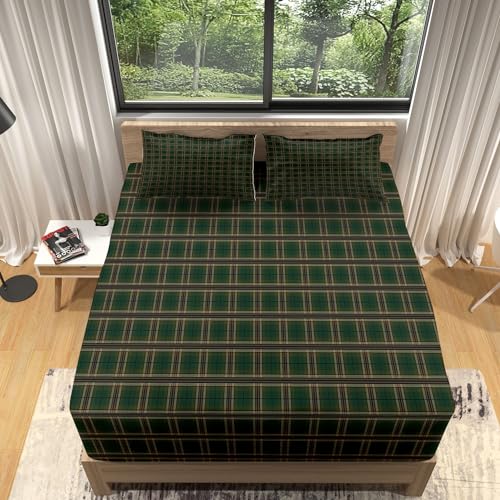 Drap Housse 160x200 Motif géométrique Vert foncé Drap Lit Imprimé Housse de Matelas 30cm Épais Protection de Matelas, Antidérapants Résistant aux Rides avec 2 Taies d'oreiller