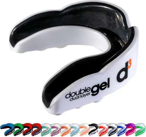 d3 Protège-dents Sport [Double Couche Gel Taille Pour Adultes 12+] Protection Bouche Dents pour Sport de Contact Boxe MMA Kickboxing Muay Thai Rugby Arts Martiaux | Étui hygiénique (Blanc/noir)