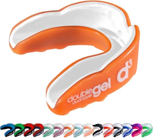 d3 Protège-dents Sport [Double Couche Gel Taille Pour Adultes 12+] Protection Bouche Dents pour Sport de Contact Boxe MMA Kickboxing Muay Thai Rugby Arts Martiaux | Étui Hygiénique (Orange/Blanc)