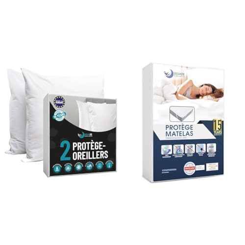 Protege Oreiller 65x65 Lot de 2 Made in EU et Oeko-TEX Dreamzie - Taie Oreiller 65x65 Anti Acarien & Protege Matelas 160x200 cm Imperméable Oeko TEX par Dreamzie - Alese 160x200 en Coton Respirant