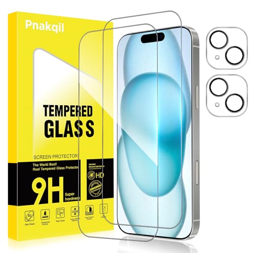 Pnakqil Verre Trempé pour iPhone 15 avec Protection Camera Vitre Protecteur Anti-Rayures Sans Bulles Ultra Résistant Dureté 9H Appareil Objectif Photo Protege HD Film écran Glass,2+2 Pièces