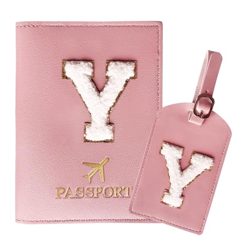 ZVRSUA Protege Passeport Rose et Etiquette Valise Costume,Pochette Passeport avec Lettre, Cuir PU, Cadeaux Femme Voyage Accessoires, Très Mignons, Adaptés aux Femmes, Adolescentes, Filles (Lettre-Y)
