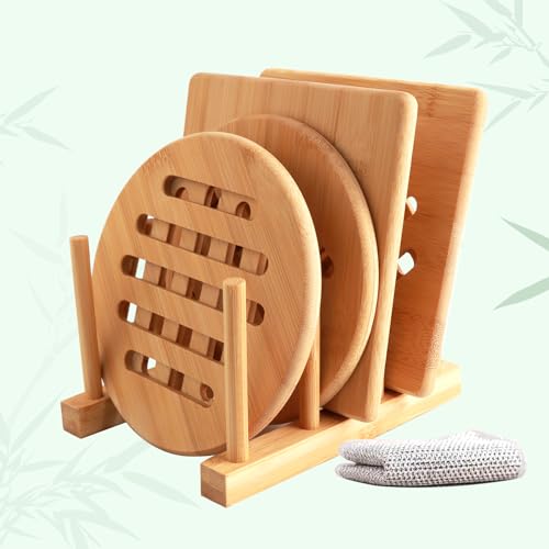 6 Pièces Dessous de Plat en Bambou, Dessous de Plats Rond Carré, sous Plat de Table Protege Poele, avec Égouttoir et Tissu de Nettoyage pour Casseroles Assiettes Tasses Bols Théières