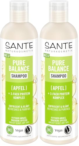 SANTE Naturkosmetik Pure Balance Shampooing pomme bio + complexe triple protéine, shampoing végétalien pour cheveux propres et rafraîchis, hydrate intensément les cheveux secs, 250 ml (Lot de 2)