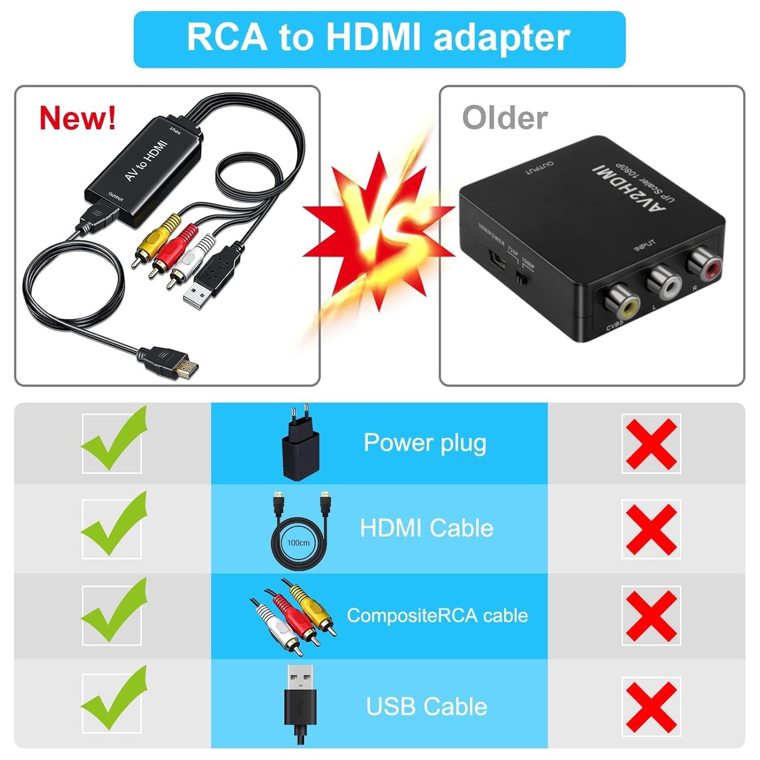 CFRY-Convertisseur RCA vers HDMI, Adaptateur AV vers HDMI, Convertisseurs Vidéo Audio Composite RCA 1080P CVBS avec Câble D'alimentation USB pour Caméra PS2 SNES VHS Xbox PS4 TV DVD Wii Supportant PA