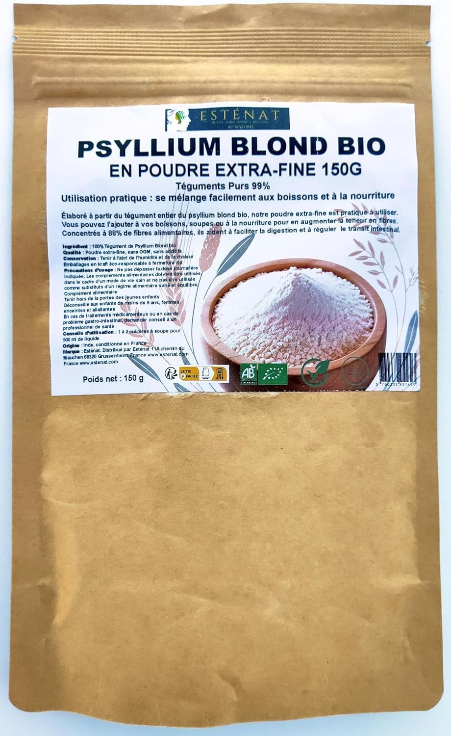 Psyllium Blond Bio en poudre extra-fine 150g - Téguments Purs 99% - ESTENAT