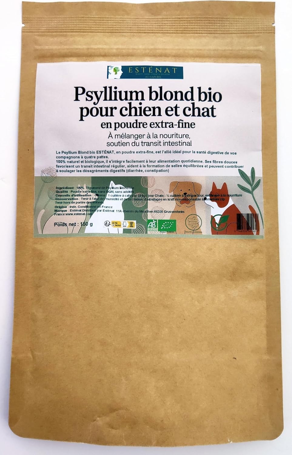Psyllium Blond Bio en Poudre Extra-Fine pour Chiens et Chats 150g - ESTENAT