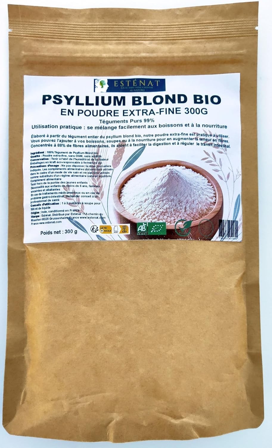 Psyllium Blond Bio en poudre extra-fine 300g - Téguments Purs 99% - ESTENAT