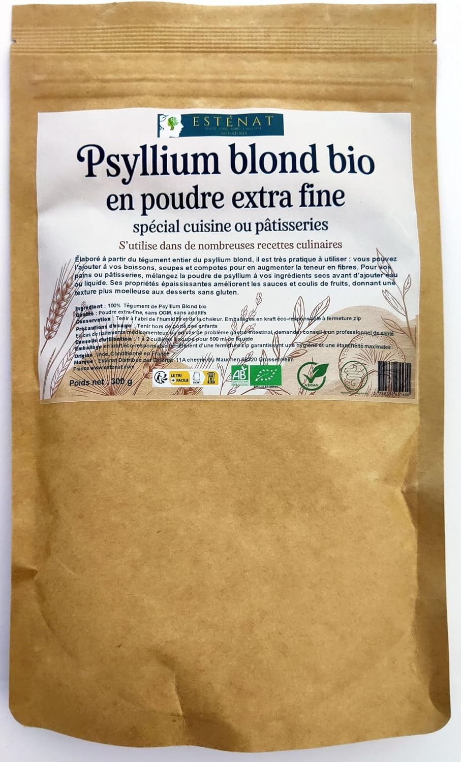 Psyllium Bio en Poudre Extra Fine, Spécial Cuisine et Pâtisseries 300g - ESTENAT