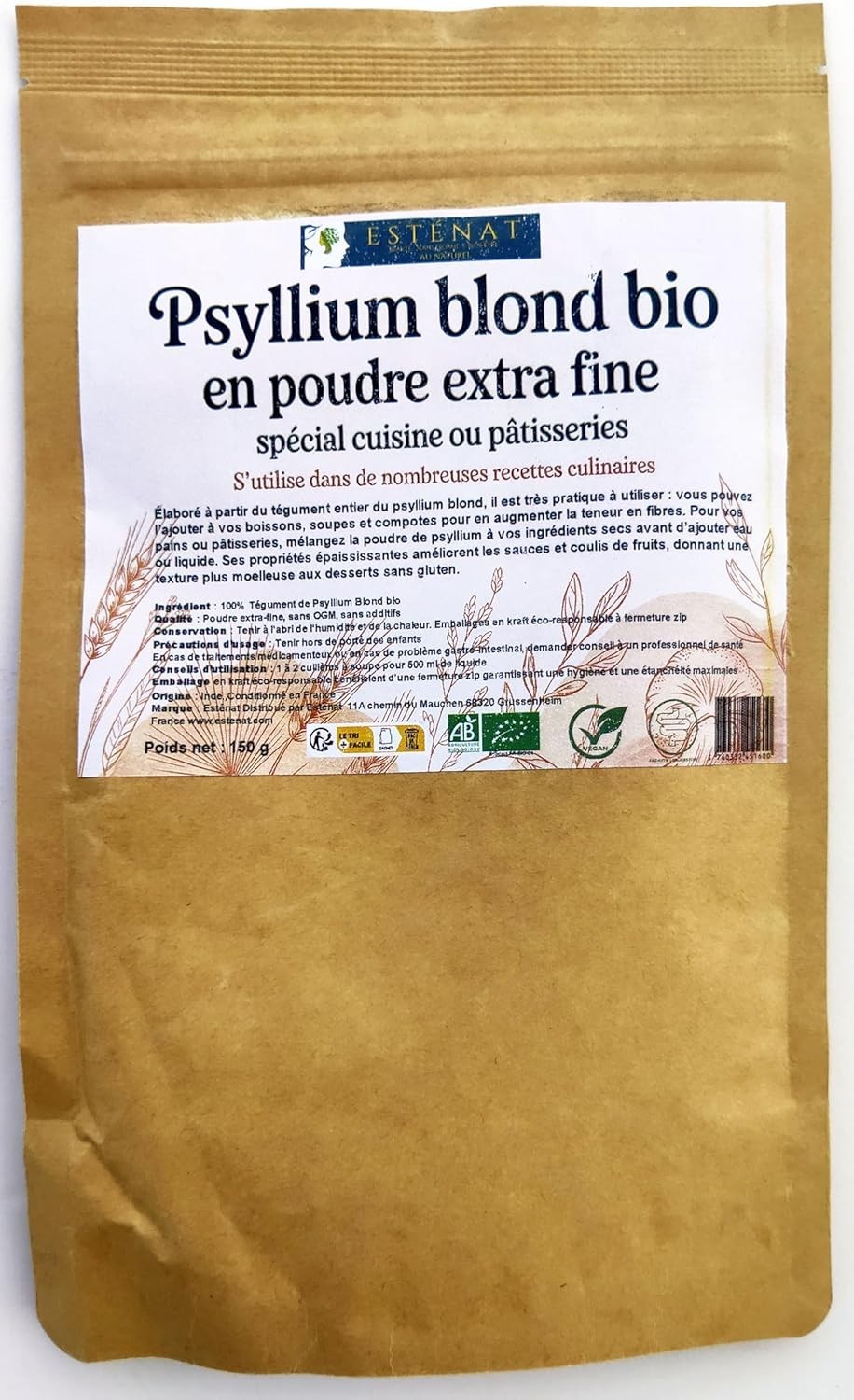 Psyllium Bio en Poudre Extra Fine, Spécial Cuisine et Pâtisseries 150g - ESTENAT