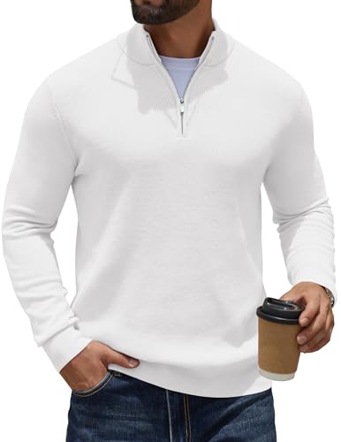 COOFANDY Pull Homme Zippé Col Roulé Pulls tricoté Manches Longues Sweat Col Montant Casaul Regular Fit Sweat-Shirt Troyer Pullover Automne Hiver Chaud Sweater Blanc L