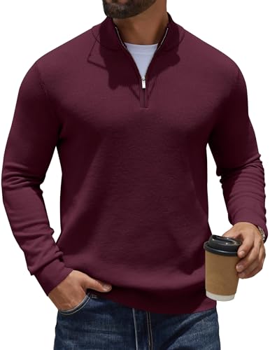 COOFANDY Pull Homme en Tricoté 1/4 Zip Pulls á Col Montant Manches Longues Pull en Maille à Col Haut Pullover 1/4 Zippé Turtleneck Sweater à Fermeture Rouge foncé M