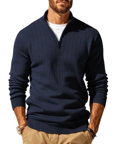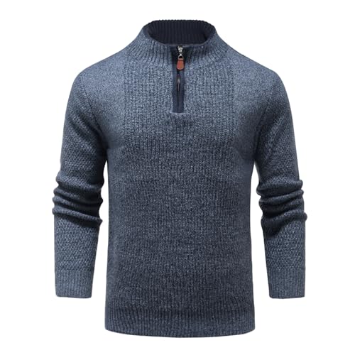 JFAN Pull Homme en Tricot avec 1/4 Zippé Pullover Sweater á Col Montant á Manches Longues Chaud Sweater Casual Solide pour Homme Bleu Foncé M