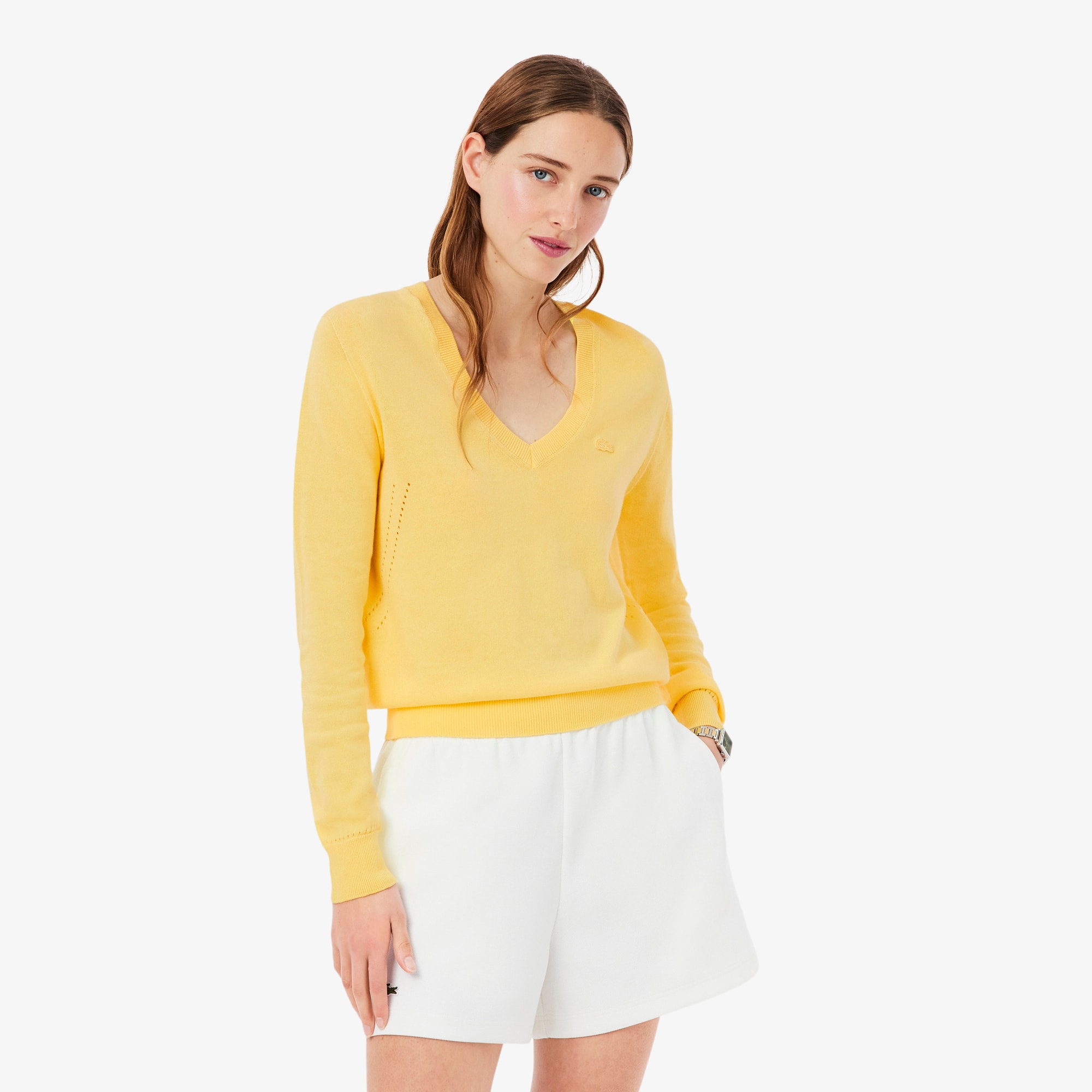 Lacoste Pull col V maille sans coutures Taille 36 Jaune Pastel