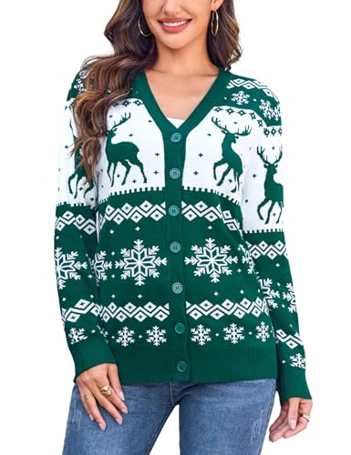 Aottori Cardigan de Noël Femme Tricot Motif Flocon et Renne Pull de Neige Manches Longues Col en V Pull Veste Chaud Christmas Chandail Doux Festif Élégante Sweater Hiver Vert M