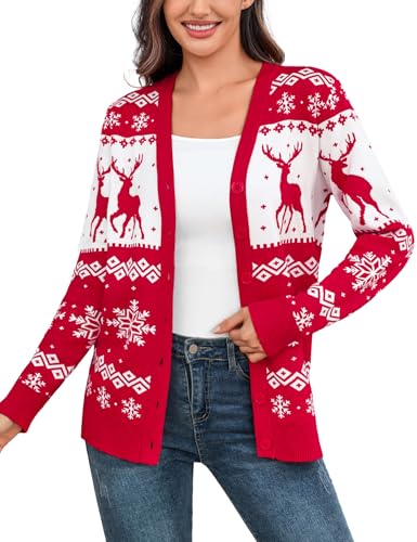 Aottori Pull de Noël Femme Manches Longues Chandail avec Bouton Tricot Motif Flocon de Neige et Renne Sweater Noël Chaud Christmas Veste Doux Festif Élégante Gilet Ouvert Avant Hiver Rouge L