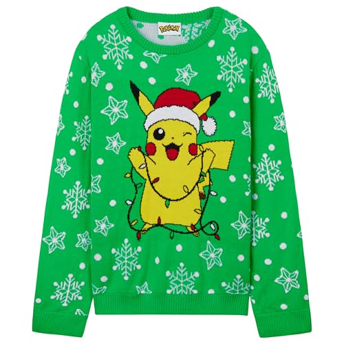 Pokémon Pull de Noel Garcon, Tricoté Sweat de Noel Enfant Mixte - Cadeau Garçon (Vert/Jaune, 13-14 Ans)