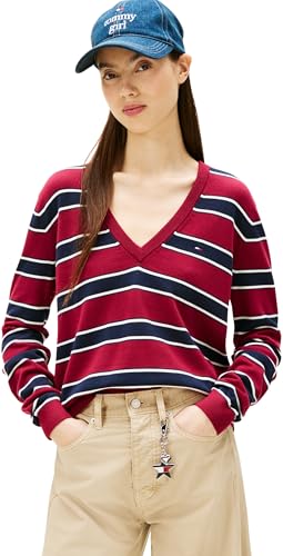 Tommy Jeans Tjw Essential Vneck Sweater Ext Dw0Dw19888 Pull-Over, Red (Lavish Cerise/Multi Stripe), M Femme