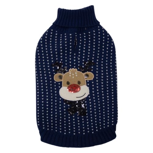 JACK AND VANILLA, Pull de noël pour Chien avec Motif Renne, avec col roulé, Idéal pour Les fêtes, Lavable en Machine, Ajustement Parfait, XS, Couleur Bleu Foncé, Modèle 5Th Avenue Dogwalk