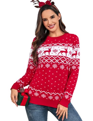 Aottori Pulls de Noël Tricot Femme Renne Imprimé Sweat Hauts Manches Longues Col Rond Pull Noël Chaud Festif Sweater Moche Drôle Christmas Sweat-Shirt Décontracté Rouge M