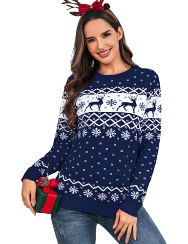Aottori Pulls de Noël Femme Flocon de Neige Imprimé Sweat-Shirt Tricot Manches Longues Col Rond Sweater Noël Drôle Festif Chandail Doux Chaud Christmas Décontracté Bleu Marine M