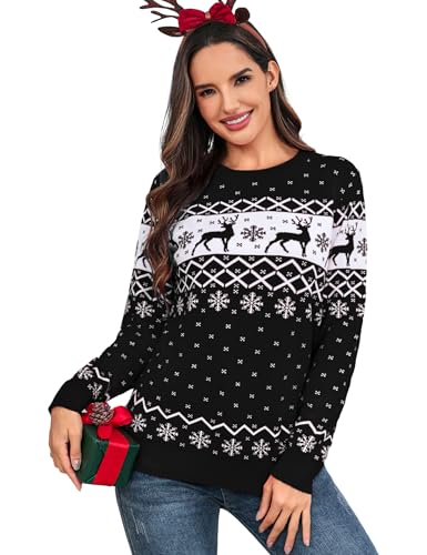 Aottori Pulls de Noël Femme Tricot Flocon de Neige Imprimé Sweat-Shirt Manches Longues Col Rond Sweater Noël Moche Chaud Sweats Drôle Festif Christmas Sweat Hauts Ugly Noir M